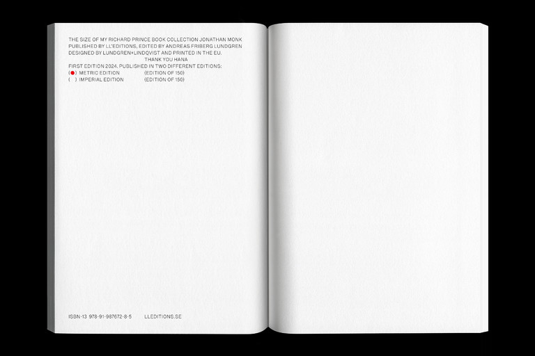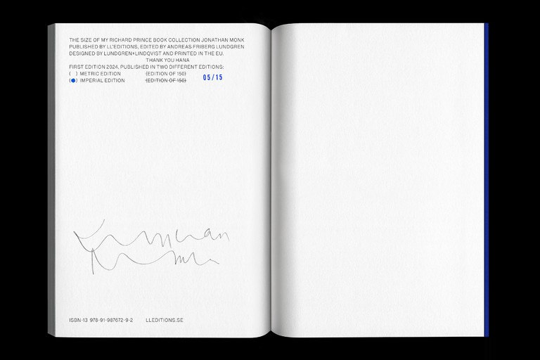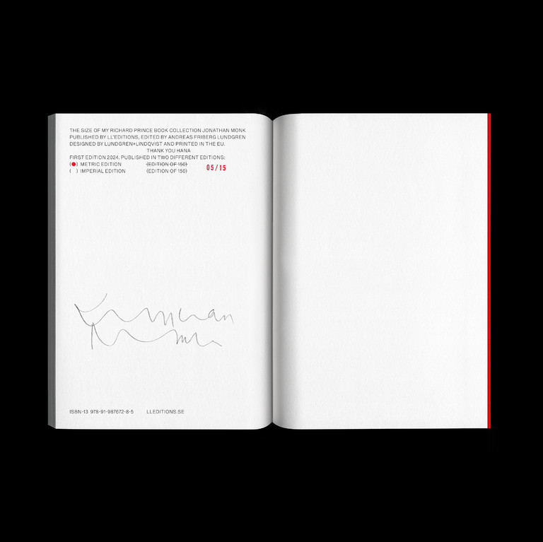 ‘The Size of My Richard Prince Book Collection’ is not Jonathan Monk’s first book to deal with his collection of books. In 2005, the artist produced the book ‘Cover Version’, which featured all the covers of the Sol LeWitt books in Monk’s personal library. And in ‘In Relief (My Collection of Sol LeWitt Books–Exact Size, Shape and Occasionally Colour)’, published by Archiv in 2015, the artist revisits his collection of LeWitt books. For the zine series ’Published by…’, (Kodoji Press) Monk documents the publishers of the books in his studio library in Berlin, categorizing them by city – one for each zine in the series. In ‘Autobiography #4’ (Tonini Editore, 2022), Monk presents his 42 copies of Ed Ruscha’s artist’s book ‘Crackers’ (supposedly Ruscha’s least favorite of his own artist’s books).